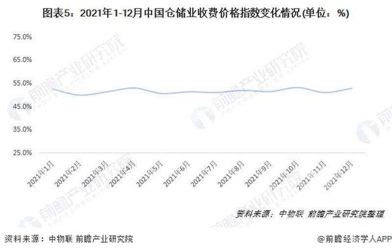 2021年,收費(fèi)價(jià)格指數(shù)均值為51.7%,高于2020年1.6個(gè)百分點(diǎn),指數(shù)連續(xù)十六個(gè)月未落入榮枯線以下,表明倉儲(chǔ)業(yè)務(wù)收費(fèi)價(jià)格保持上升勢(shì)頭。