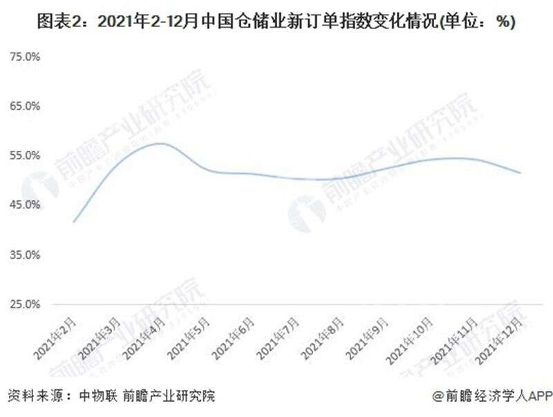 從中物聯(lián)發(fā)布的中國倉儲(chǔ)指數(shù)中的新訂單指數(shù)變化情況來看,2021年2-12月中國倉儲(chǔ)業(yè)新訂單指數(shù)均值為51.8%,同比下降0.4個(gè)百分點(diǎn);顯示出倉儲(chǔ)行業(yè)受新冠疫情、全球經(jīng)濟(jì)下行等因素影響導(dǎo)致行業(yè)需求整體趨弱。