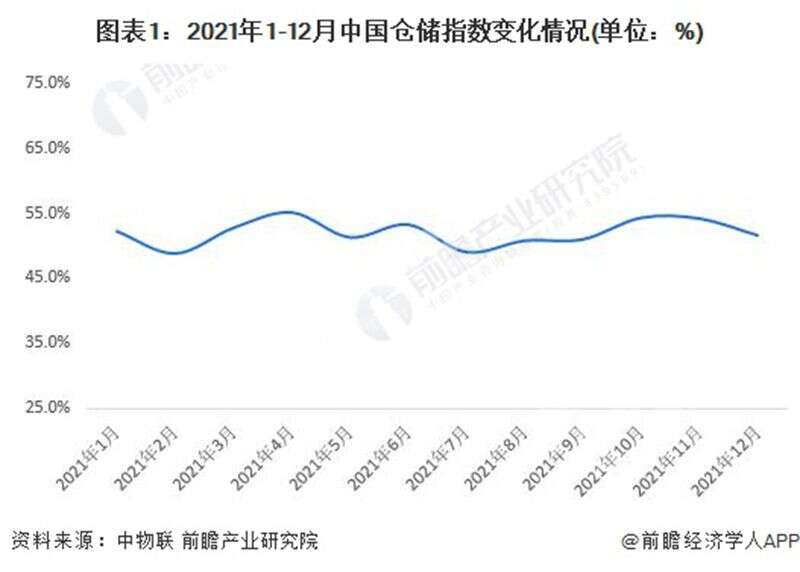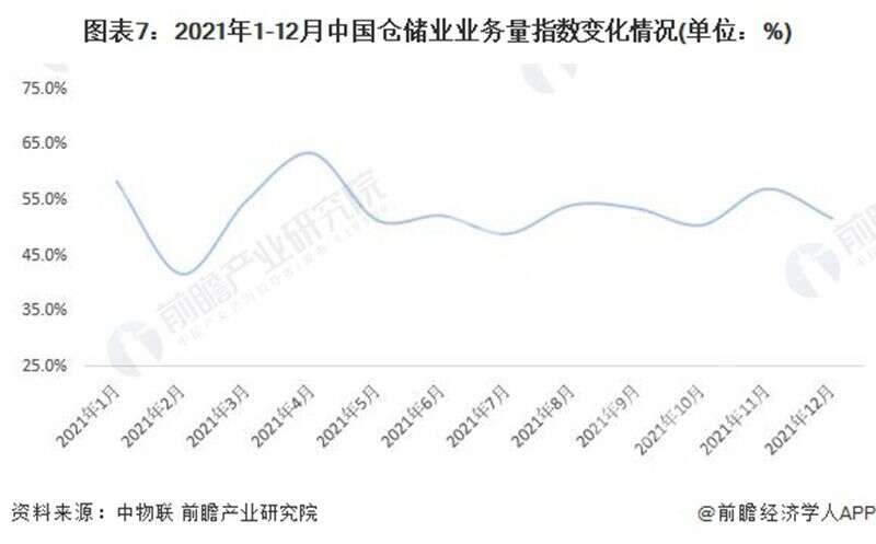 根據(jù)中國物流與采購聯(lián)合數(shù)據(jù),2021年1-12月,中國倉儲(chǔ)業(yè)務(wù)量指數(shù)均值為53.1%,同比增長0.7%,整體位于枯榮線(50%)以上,反映出倉儲(chǔ)行業(yè)需求在企業(yè)生產(chǎn)活動(dòng)加快和消費(fèi)品需求保持回升的背景下,仍保持較為穩(wěn)定的態(tài)勢(shì)。